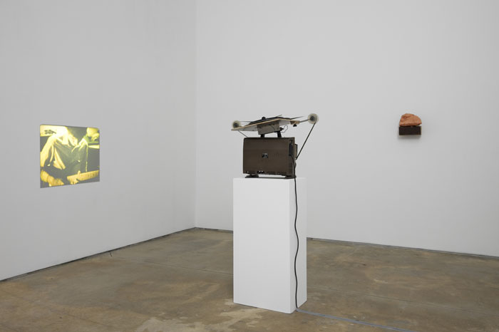 Clay, record player, record, plexiglass pedestal, laminated photographs, framed drawing