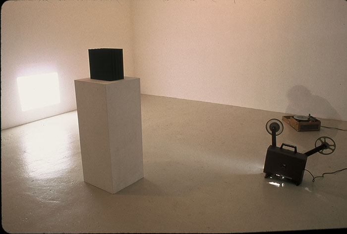 "In this film there was an event, and two documentations of this event. Each is presented on a different analog machine, and each requires the viewer to get that machine going. The film is just two minutes long, and the record lasts 9:59, so there is an inevitable disjuncture between the syncing of the visual and the auditory. So what becomes important is that the object exists outside of itself. That is, its meaning is not in the visual or auditory, these two entities are dark and muddled (and as documentation they fail), but rather in the malleable coexistence of the two as a specific time split into parts and then contained in separate sensory machines that present them as such. It has been done in an edition of five, and the ephemeral qualities of sound and vision are figuratively and literally contained in handsome boxes as "film" and "vinyl record", ready to sit on a shelf. The boxes and their contents become a physical manifestation of the idea. They act as place markers or as mementos, symbolic of something more." - Hurray.